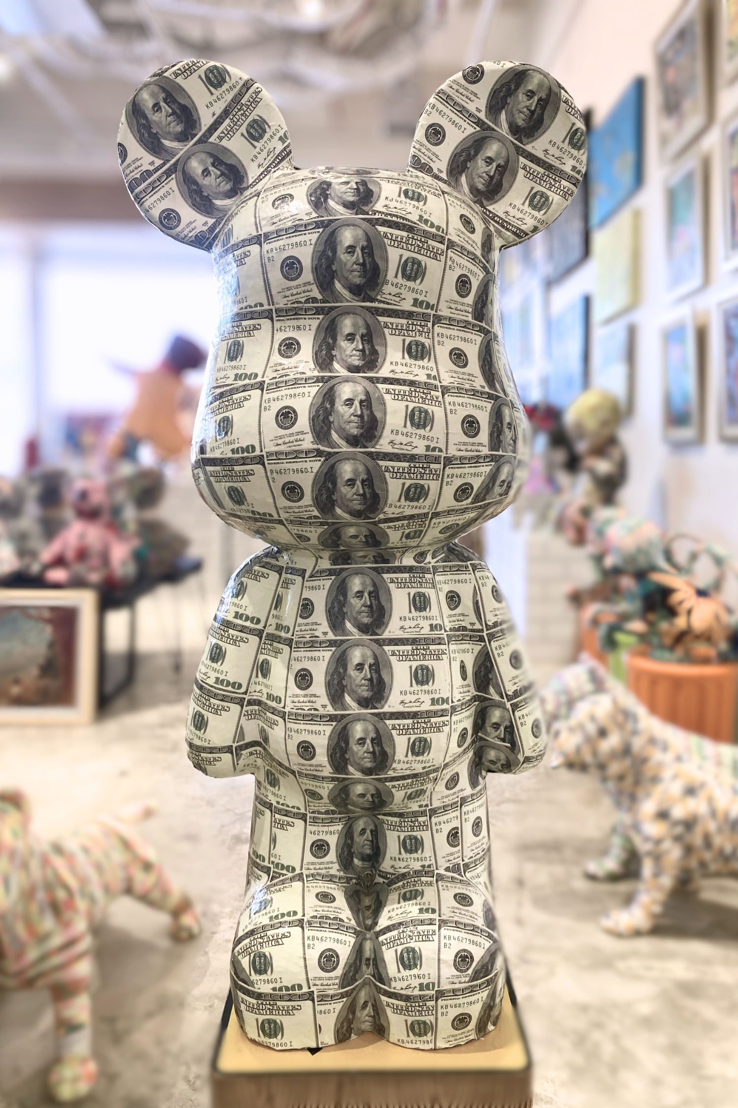 Permainan antara kemewahan dan ironi lewat detail dolar yang membungkus tubuhnya. Setiap teksturnya memancarkan karakter dan keunikan tersendiri.