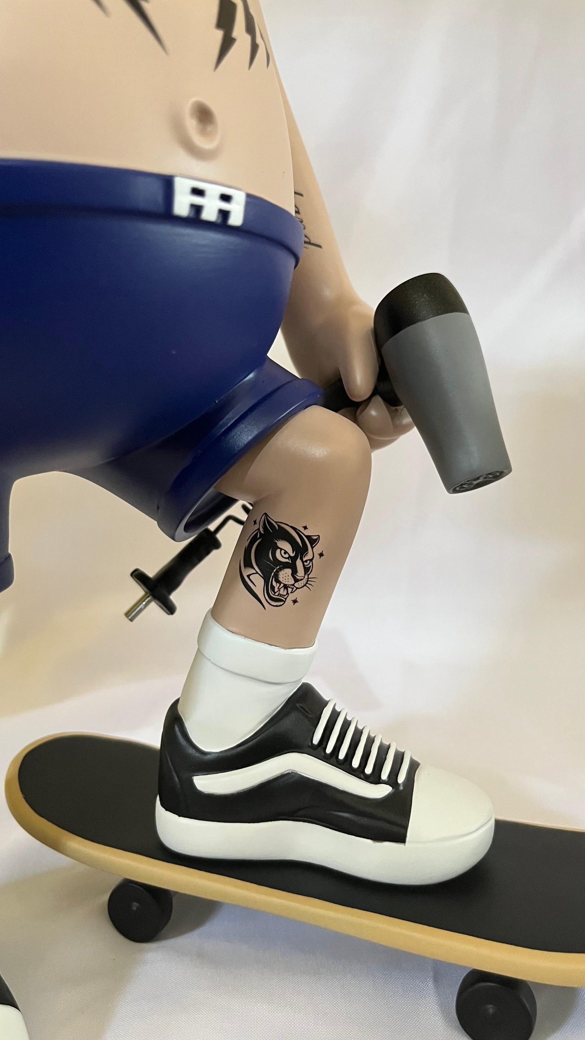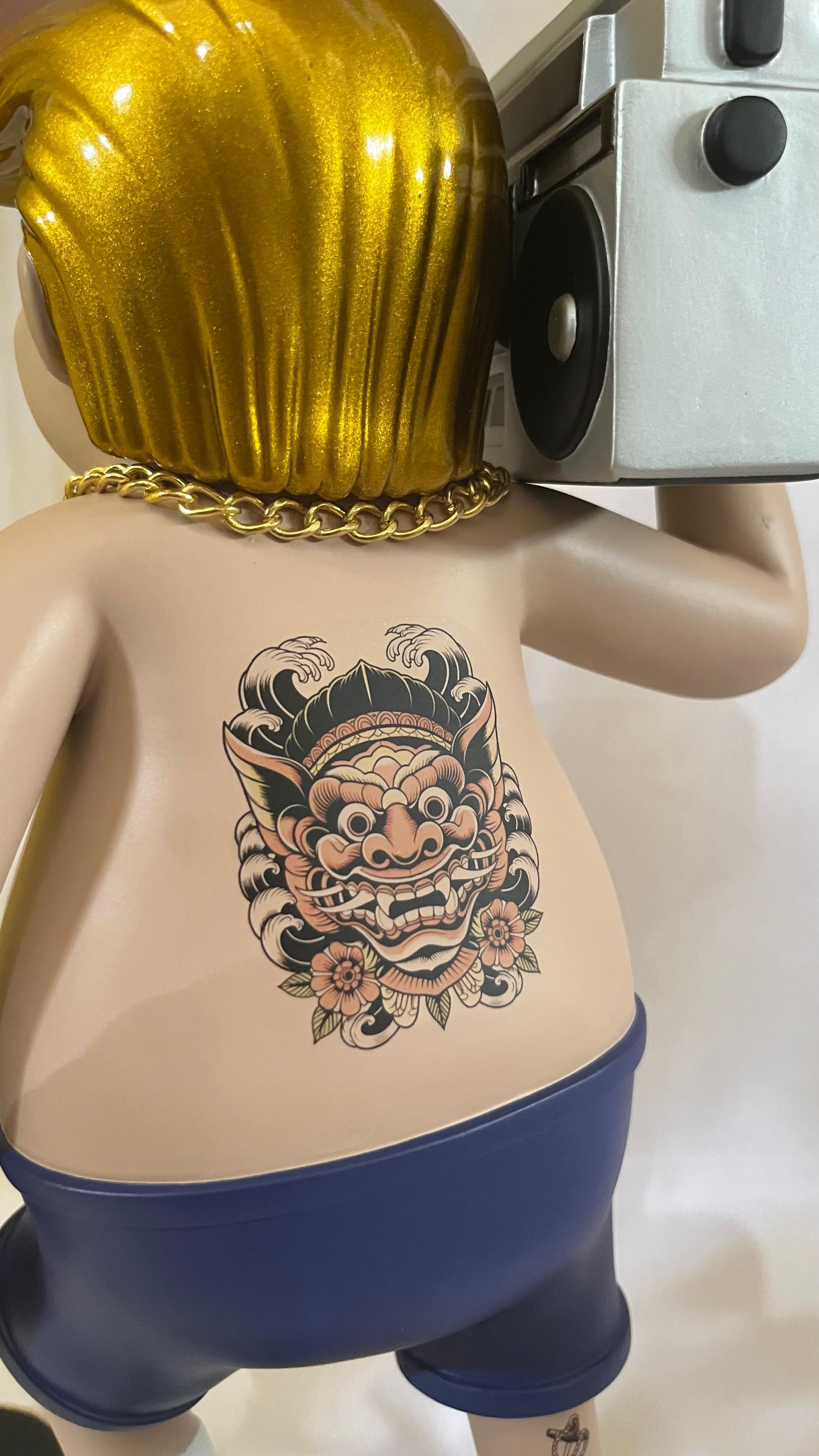 Figur ini digambarkan bertelanjang dada, mengenakan celana pendek, sneakers, dan berpose percaya diri di atas papan skateboard. Tubuhnya dipenuhi tato dengan simbol-simbol kekuatan bercampur gaya personal. Kalung emas tebal menggantung di lehernya, dihiasi liontin potret dirinya sendiri — sentuhan halus yang menyinggung semangat narsis dalam karya ini. Di satu tangan, ia membawa boombox klasik, penghormatan pada kultur jalanan dan energi visual khas era ‘90-an.