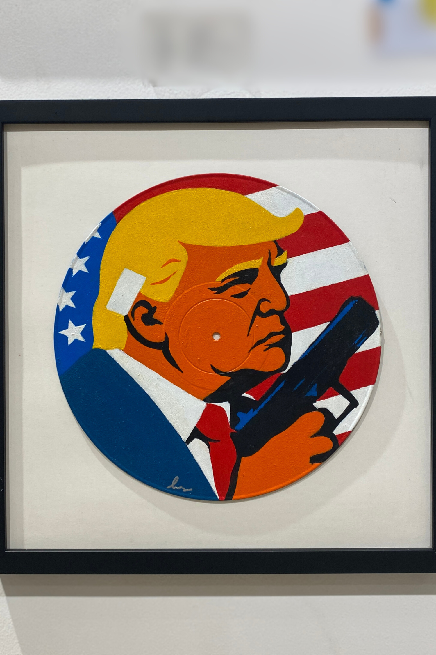 Karya ini adalah ledakan visual antara budaya pop, politik, dan musik — The Man with Golden Hair Vinyl Record memadukan ikon global dengan simbol budaya Amerika, menghadirkan satir yang berani dan cerdas. Dilukis langsung di atas piringan hitam (vinyl record), karya ini bukan sekadar potret, tapi komentar tajam tentang kekuasaan, identitas, dan absurditas zaman modern.
